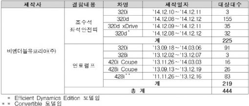 이 자동차 소유자는 이달 31일부터 비엠더블유코리아(080-269-2200) 서비스센터에서 무료로 조수석 좌석 안전띠와 연료 펌프를 교환할 수 있다. 결함을 직접 수리한 경우에는 제작사에 수리비 보상을 신청할 수 있다.