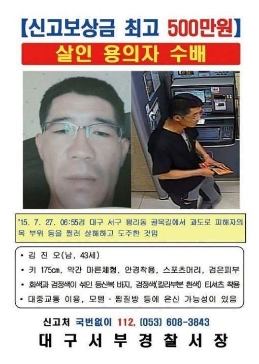 지난 27일 유력한 용의자로 지목된 김모씨는 대구시 서구 평리동 한 빌라 앞에서 출근을 하기 위해 집을 나서던 A씨를 흉기로 찔러 숨지게 한 혐의를 받고 있다. 김씨는 키 175cm가량의 약간 마른 체형이며 스포츠 머리, 검은 피부에 안경을 착용했다.