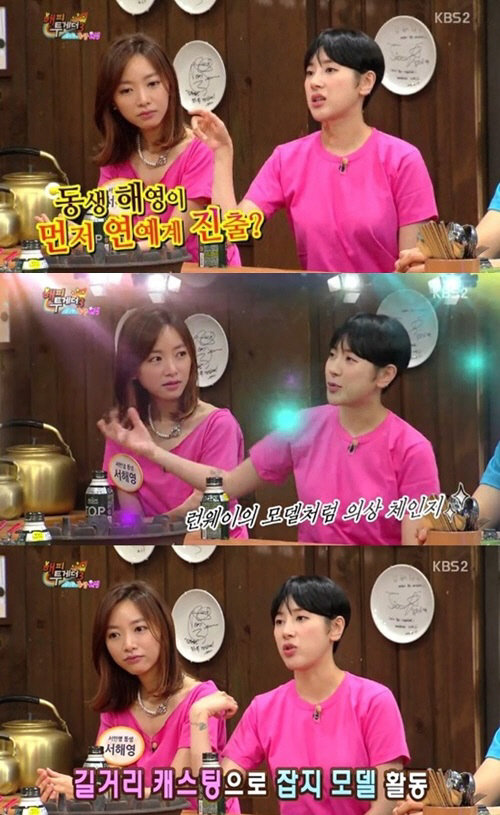 서해영은 “가수 서인영의 친동생입니다”라고 자신을 소개했다. 이날 서인영은 “동생이 잠실 얼짱 출신이다. 지금은 아버지 회사에서 디자인 마케팅을 하고 있다”고 소개했다.