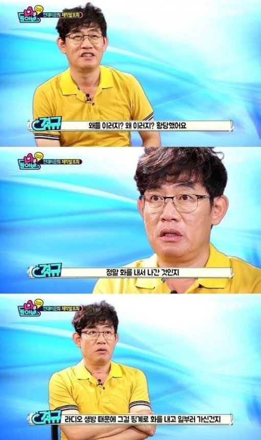 이에 매니저 이경규는 제작진과의 인터뷰를 통해 “왜 이러지? 했다. 뭔지 아무것도 몰랐다”며 “정말 화를 내서 나간 것인지, 아니면 라디오 생방 때문에 가신 것인지, 그걸 핑계로 화를 내고 일부러 가신 것인지. 왜 가신 것인지에 대해 현장에서는 아무 생각도 못했다”라고 밝혔다.