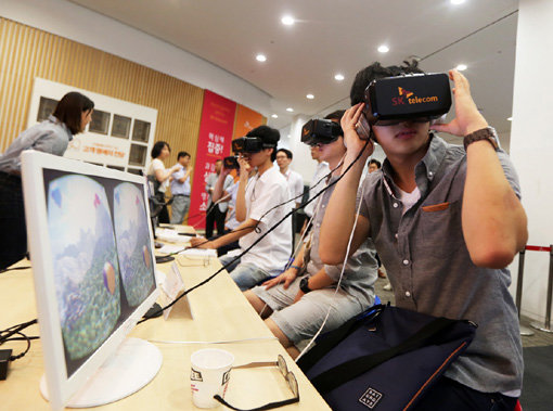 SK텔레콤이 7월22일 서울 을지로 본사에서 개최한 증강·가상현실 등 실감형 멀티미디어서비스 주제포럼에 참석한 국내 개발자들이 혁신적인 IT기기를 체험하고 있다. 사진제공|SK텔레콤