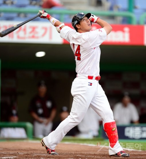 2일 LG전을 앞둔 문학구장. 개인훈련을 끝내고 덕아웃에서 그라운드 위의 선수들을 지켜보던 SK 조동화(34)가 걱정 어린 목소리로 한마디를 했다. 최정(28·사진)이 후텁지근한 날씨에 훈련 시작부터 끝날 때까지 프리배팅과 토스배팅을 오가면서 계속 방망이를 휘두르고 있었기 때문이었다.