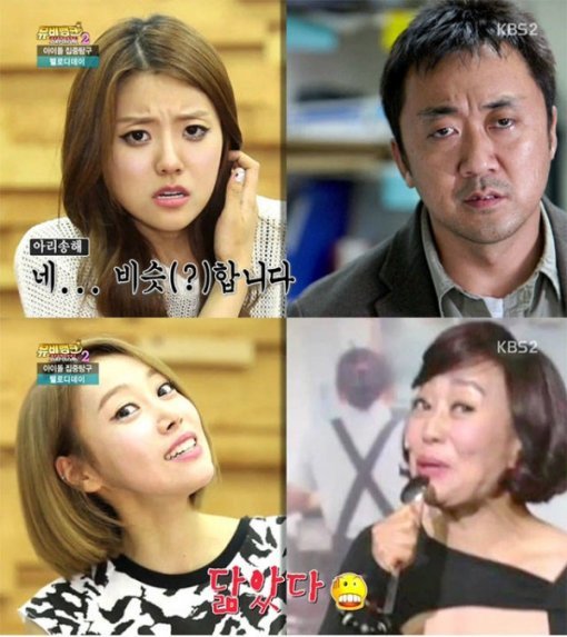 공개된 사진은 ‘뮤직뱅크’ 방송화면 캡처 사진으로 멜로디데이 예인은 배우 마동석의 표정을 따라하고 있으며, 여은은 가수 하춘화의 표정을 똑같이 재현하고 있다.