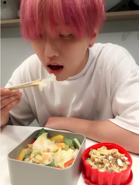 공개된 사진 속에는 날렵한 턱선을 자랑하는 산들이 각종 야채와 렌틸콩 고구마 샐러드가 담겨 있는 도시락을 먹고 있는 모습이 담겨 있다.