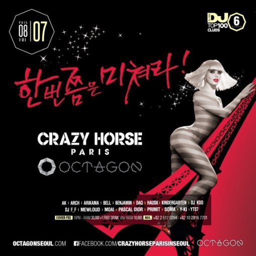 세계에서 가장 섹시한 공연으로 알려진 프랑스 오리지널 아트누드쇼 ‘크레이지호스 파리(Crazy Horse Paris)’가 국내 뿐 아니라 세계적으로도 유명한 대한민국 대표 클럽 ‘옥타곤’과 함께 컬라버레이션 파티를 진행된다. 이번 파티는 스트레스,권위, 옷 모든 것을 벗어던지고, 프랑스의 수준높은 아트와 관능의 쇼에 미처보라는 취지로 ‘한번쯤은 미처라’라는 콘셉트로 진행된다.