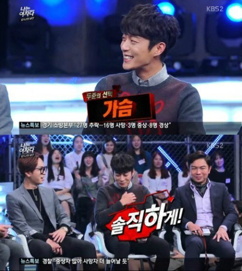 MC 유재석은 윤두준에게 무엇을 선택했느냐 물었고, 윤두준은 “저는 가슴이다”라고 고백했다. 이에 유재석은 “구체적인 이유는 묻지 않겠다”며 상황을 정리했다.