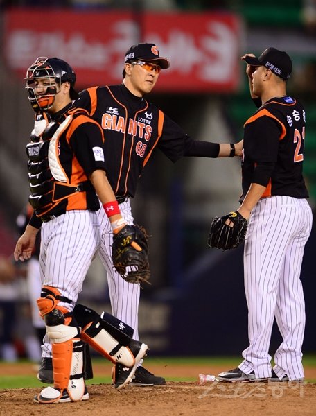 롯데 마운드는 마지막 포스트시즌이었던 2012년과 견줘 다를 게 없다. 주축 선수들은 30대 중반 이상의 고참들로 짜여져 있고, 그나마 뛰고 있는 젊은 피는 외부에서 수혈해온 선수다. 정책적으로 성장·발전시킨 투수는 찾아보기 힘들다. 염종석 투수코치(가운데)가 마운드에 선 송승준(오른쪽)을 다독이고 있다. 스포츠동아DB