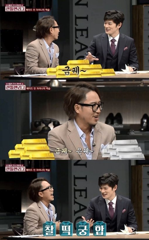 ‘젠틀맨리그’는 대한민국을 들썩이게 하는 최신 이슈들을 사회, 경제, 역사적 관점에서 풀어보는 본격 교양 토크 프로그램. MC로는 정재형과 장기하가 활약한다. 6일 방송에서는 ‘메이드 인 차이나’의 역습을 주제로 중국인들의 통 큰 소비 스케일부터 중국 경제력의 원천까지 알아보고, 다양한 분야에서 두각을 나타내는 ‘차이니즈 파워’를 심도 있게 살펴본다.