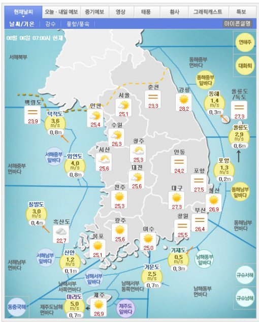 현재 기온은 서울 25.1도, 인천 25.4도, 수원 26.3도, 강릉 27.5도, 춘천 23.3도, 대전 25.6도, 전주 25.9도, 광주 25.6도, 대구 27.3도, 창원 25.5도, 부산 26.4도, 제주도 26.9도 등으로 어제(5일)와 비슷하겠다.