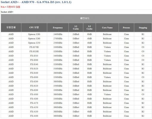 근데, 여담이지만 기가바이트 메인보드는 동일한 모델명의 메인보드라도 출고 시기에 따라 일부 사양이 변경되는 경우가 많아요. 이를 리비전 변경이라고 하는데, GA-970A-D3 모델은 초기 모델인 리비전 1.0부터 가장 후기 모델인 리비전 3.0까지 있습니다. 리비전에 따라 CPU 호환 목록 역시 따로 제공하고 있으니 참고하세요. 질문자님의 GA-970A-D3는 어떤 리비전 제품인지 알 수 없으니 일단 가장 초기 모델인 1.0 제품이라고 가정하겠습니다. 리비전은 대개 기판에 인쇄되어있고, CPU-Z 같은 프로그램으로 확인도 가능합니다.