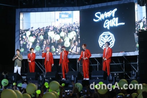B1A4(산들, 진영, 바로, 공찬, 신우)가 6일 오후 서울시 강남구 M스테이지에서 열린 게릴라 콘서트에서 공연을 하고 있다.