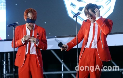 B1A4(산들, 진영, 바로, 공찬, 신우)가 6일 오후 서울시 강남구 M스테이지에서 열린 게릴라 콘서트에서 안대를 벗고 있다.