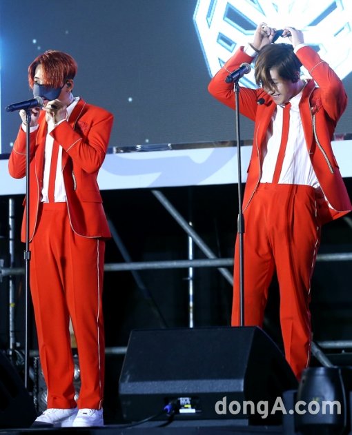 B1A4(산들, 진영, 바로, 공찬, 신우)가 6일 오후 서울시 강남구 M스테이지에서 열린 게릴라 콘서트에서 안대를 벗고 있다.