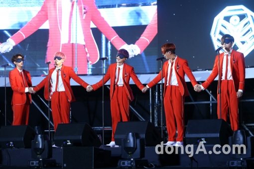 B1A4(산들, 진영, 바로, 공찬, 신우)가 6일 오후 서울시 강남구 M스테이지에서 열린 게릴라 콘서트에서 안대를 벗고 있다.