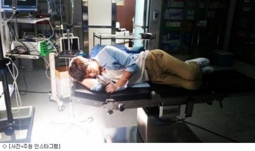 공개된 사진 속에서 주원은 세트장으로 보이는 수술 침대에 누워 잠을 자는 모습으로 눈길을 끌었다.