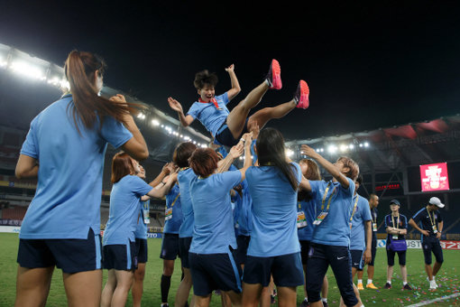2015동아시안컵 개최국 중국 취재진이 남북대결에 앞서 대거 한국남녀대표팀의 훈련장을 찾아 눈길을 끌었다. 특히 파죽지세의 상승세를 탄 태극낭자들을 향한 시선이 많았다. 중국, 일본을 연파하며 기대이상의 성적을 냈기 때문이다. 한 시절 최강 자리를 지키다 끝 모를 추락을 거듭하고 있는 자국 여자축구를 바라본 중국 기자들은 “WK리그의 선수단 평균 연봉은 얼마냐”, “대표팀에 대한 축구협회의 지원은 어느 정도냐” 등 질문 보따리를 풀어놓았다. 중국여자대표팀 하오웨이 감독은 이 대회에서 3전패를 당해 지휘봉을 내려놓았다.