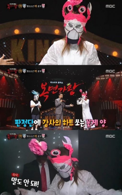 이날 ‘복면가왕’ 1라운드 1조 ‘귀여운 튜브소년’과 ‘꼴을 든 꽃게’는 아이유와 임슬올의 ‘잔소리’를 열창했다. 결과는 꽃을 든 꽃게가 52표를 받아 2라운드 진출을 확정 지었다. 귀여운 튜브소년은 탈락했다.