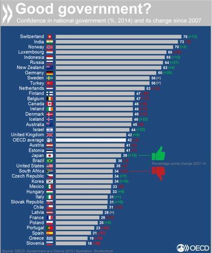 9일 경제협력개발기구(OECD)의 ‘한눈에 보는 정부 2015’ 보고서에 따르면 2014년 기준 한국 정부에 대한 국민의 신뢰도는 34%로 집계됐다.