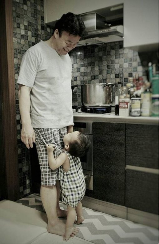 소유진이 공개한 사진에는 주방에서 미역국을 끓이고 있는 남편 백종원과 응석을 부리고 있는 아들 용희 군의 모습이 담겨 있다.