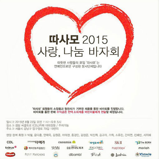 공개된 사진에는 ‘따사모’에서 주최하는 바자회 행사 포스터가 담겨 있다. 특히 이번 바자회에 참석하는 스타들의 명단이 공개돼 시선을 모은다.