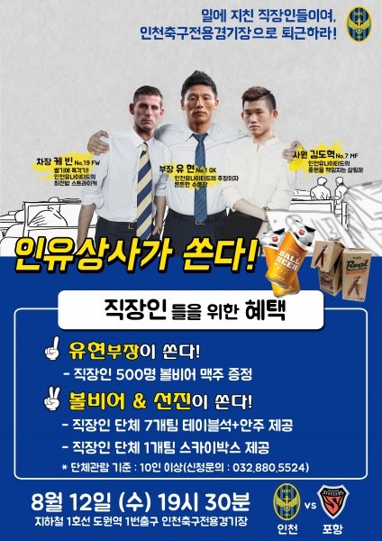 일과 가정(삶)이 공존하는 ‘일家양득 캠페인’에 앞장서며 건전한 직장인 회식문화 만들기를 실천하고 있는 인천은 이 날 경기에서 직장인들을 위한 특별한 이벤트를 준비했다.