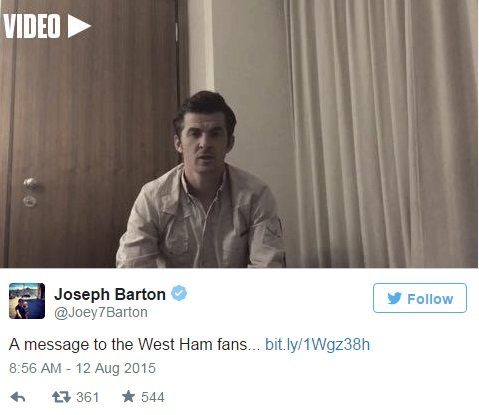 바튼은 11일(이하 한국시각) 자신의 트위터를 통해 웨스트햄 팬들에게 전하는 영상 메시지를 공개했다.