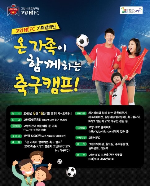 고양은 오는 16일(일) 오후7시 고양종합운동장에서 펼쳐지는 현대오일뱅크 K리그 챌린지 2015 27R 대구FC(이하 대구) 경기에 앞서 지난 시즌 총 3차례에 걸쳐 진행한 가족 캠페인의 연속으로 관내 어린이 자녀를 둔 가족을 대상으로 가족 축구 캠프를 개최한다.