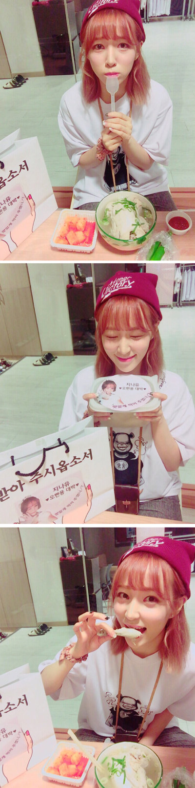 지나유는 12일 자신의 SNS를 통해 “말복에 이런 센스있는 선물을!! 감사합니다. 힘내서 연습할께용”이라는 글과 함께 말복을 맞아 삼계탕 조공 인증샷을 게시했다.
