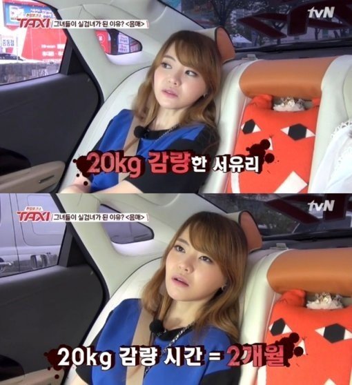 앞서 서유리는 11일 방송된 tvN ‘현장토크쇼 택시’에서 과거 몸무게가 70kg까지 나갔다고 털어놓으며 “2개월 동안 20kg을 감량했다”고 밝혔다.