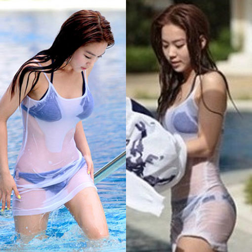 공개된 화보 속 김희정은 비키니를 입고 속이 비치는 흰색 민소매 티셔츠를 걸친 채 수영장에서 나오고 있다. 티셔츠가 물에 젖어 잘록한 허리와 글래머러스한 몸매가 적나라하게 드러나 눈길을 끌었다.