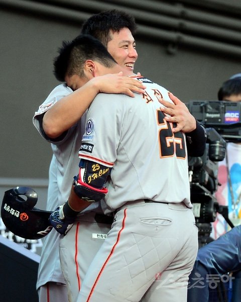 12일 수원 kt위즈파크에서 ‘2015 타이어뱅크 KBO리그’ kt 위즈와 한화 이글스의 경기가 열렸다. 1회초 2사 1루에서 금지약불 복용으로 출장정지 징계를 받은 뒤 복귀한 한화 최진행이 kt 선발 주권을 상대로 중월 투런 홈런을 쏘아올린 뒤 김태균의 환영을 받고 있다.