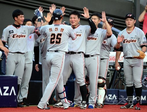 12일 수원 kt위즈파크에서 ‘2015 타이어뱅크 KBO리그’ kt 위즈와 한화 이글스의 경기가 열렸다. 1회초 2사 1루에서 금지약불 복용으로 출장정지 징계를 받은 뒤 복귀한 한화 최진행이 kt 선발 주권을 상대로 중월 투런 홈런을 쏘아올린 뒤 동료들의 환영을 받고 있다.