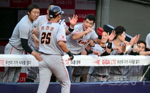 12일 수원 kt위즈파크에서 ‘2015 타이어뱅크 KBO리그’ kt 위즈와 한화 이글스의 경기가 열렸다. 1회초 2사 1루에서 금지약불 복용으로 출장정지 징계를 받은 뒤 복귀한 한화 최진행이 kt 선발 주권을 상대로 중월 투런 홈런을 쏘아올린 뒤 동료들의 환영을 받고 있다.