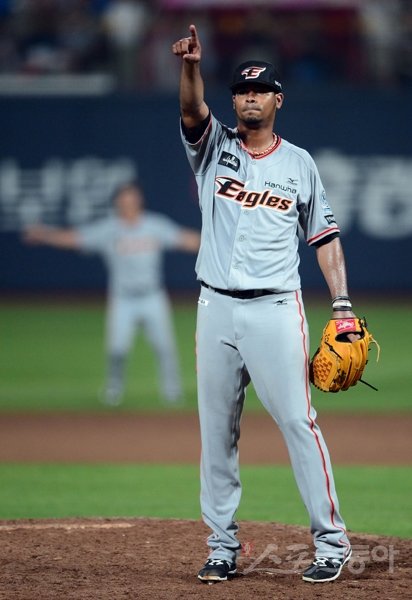 한화 에스밀 로저스가 11일 수원 kt전에서 4-0으로 앞선 9회말 2사 후 마지막 아웃카운트를 잡기 전 관중석을 향해 세리머니를 하고 있다. 로저스는 KBO리그에 데뷔하자마자 2경기 연속으로 완투하는 괴력을 보였다. 스포츠동아DB