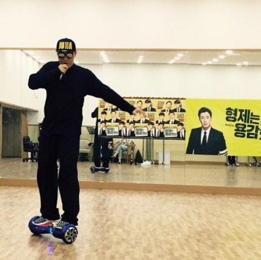 사진 속 정준하는 마이크를 들고, 무언가를 타고 있다. 무대 퍼포먼스의 일부가 아닌 것인지 궁금증을 자아낸다.