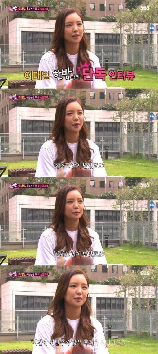 이날 방송에서 이태임은 “상처도 많이 받았고 시간이 지나면 지날수록 후회가 된다”고 고백했다.