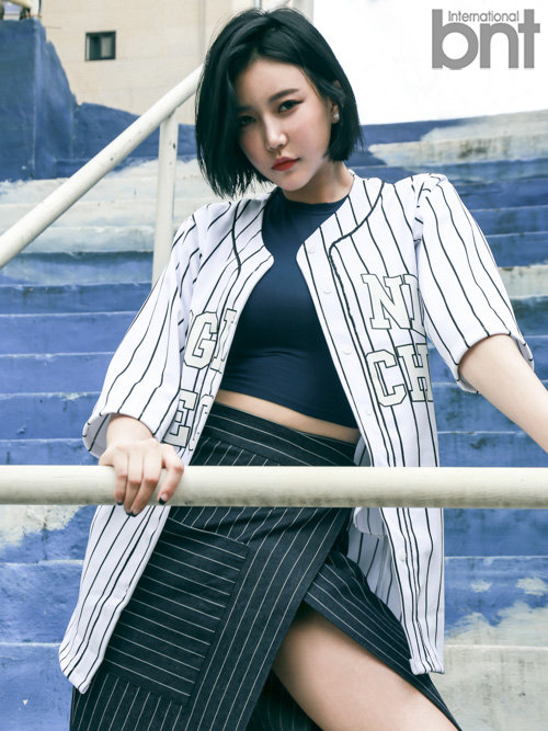 세 번째는 스포츠라는 콘셉트로 스트라이프 패턴의 베이스볼 재킷과 몸에 쫙 달라붙는 크롭톱, 절개 라인이 섹시하게 들어간 스커트로 스포티한 룩을 연출했다. 마지막 콘셉트도 데님소재의 셔츠와 스커트를 매치해 캐주얼한 룩으로 마무리했다.