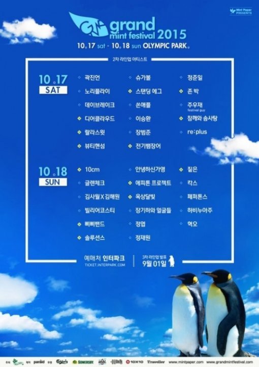 한편 '그랜드 민트 페스티벌 2015(GMF2015)'는 10월 17일~18일 양일간 올림픽공원 일대에서 열리며, 보다 자세한 내용은 민트페이퍼 공식 홈페이지(www.mintpaper.com)와 페이스북(www.facebook.com/GrandMintFest)에서 확인할 수 있다.
