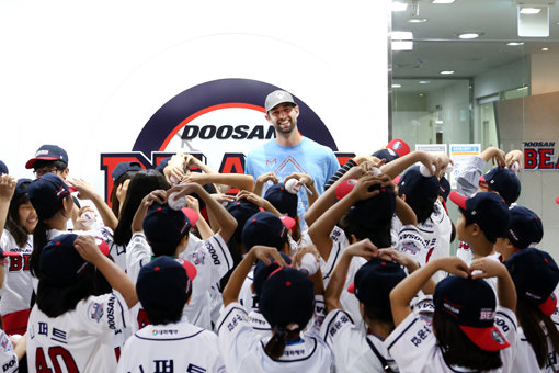 두산의 모범 용병 더스틴 니퍼트는 2013년부터 매달 ‘사랑의 좌석’ 초청행사를 진행하고 있다. 행사에 초대받은 어린이들이 니퍼트(가운데 정면)를 향해 사랑의 하트를 그려 보이고 있다. 사진제공|두산 베어즈