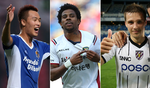 울산현대 김신욱-FC서울 아드리아노-전남 드래곤즈 오르샤(맨 왼쪽부터). 사진제공|한국프로축구연맹·대전시티즌