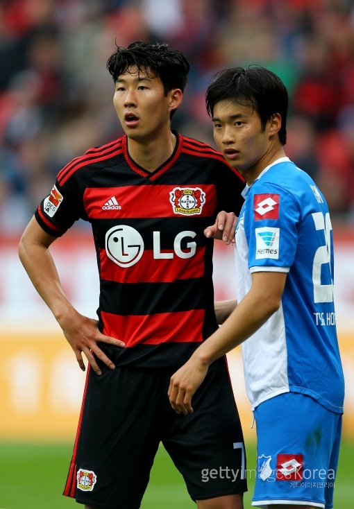 ‘우정은 잠시 안녕!’ 레버쿠젠 손흥민이 15일(한국시간) 홈구장 바이아레나에서 열릴 2015~2016시즌 독일 분데스리가 개막전에 선발출전할 것이 유력시되면서 호펜하임 김진수(오른쪽)와 3번째 맞대결을 펼칠 가능성이 높아졌다. 손흥민과 김진수는 둘도 없는 친구지만, 소속팀의 승리를 위해 우정은 잠시 잊어야만 한다. 사진=ⓒGettyimages멀티비츠