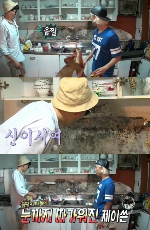 제이쓴은 외마디 비명을 지른 뒤 “어우 눈이 따갑다”며 “지금 곰팡이가 벽면 뒤에도 올라가 있는 것 같아서 이게 나무까지 번지면 나무가 다 썩는다. 찬장이 무너질 수도 있다”고 걱정했다.