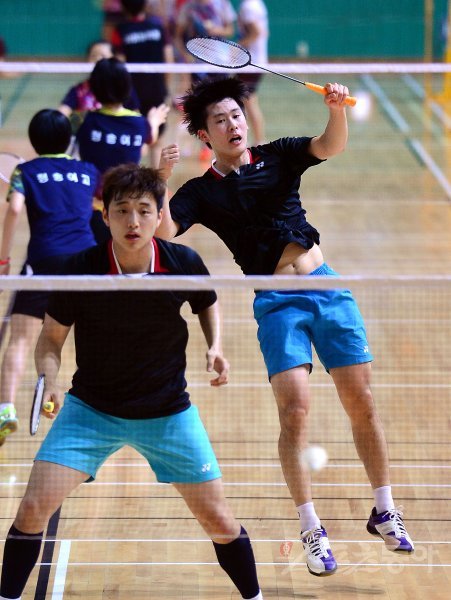 ‘이용대 올림픽제패기념 2015 화순 전국 초·중·고·대 학교대항 배드민턴선수권대회’가 13일부터 19일까지 전남 화순 하니움문화스포츠센터와 이용대체육관에서 열린다. 15일 남자대학부 단체전 결승에서 동의대 박권훈(오른쪽)-전봉찬 조가 스매싱 공격을 하고 있다. 동의대는 3-0 승리를 거두며 우승을 차지했다. 화순 | 김종원기자 won@donga.com