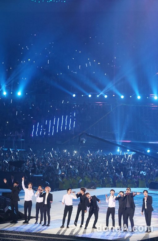 그룹 엑소와 god가 15일 오후 서울 마포구 상암동 월드컵경기장에서 열린 대한민국 광복 70주년 국민대합창 ‘나는 대한민국’ 에서 합동 무대를 꾸미고 있다.