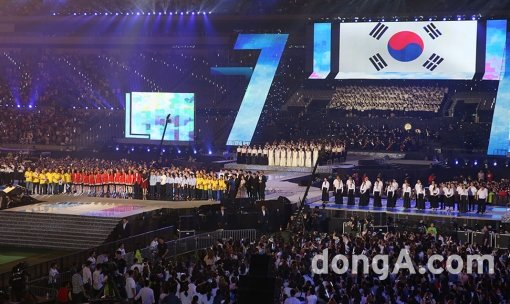 15일 오후 서울 마포구 상암동 월드컵경기장에서 열린 대한민국 광복 70주년 국민대합창 ‘나는 대한민국’ 에서 전 출연진이 합동 무대를 꾸미고 있다.