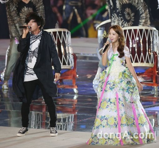 가수 윤도현(왼쪽)과 송소희가 15일 오후 서울 마포구 상암동 월드컵경기장에서 열린 대한민국 광복 70주년 국민대합창 ‘나는 대한민국’ 에서 합동 무대를 꾸미고 있다.