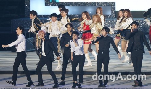 그룹 엑소가 15일 오후 서울 마포구 상암동 월드컵경기장에서 열린 대한민국 광복 70주년 국민대합창 ‘나는 대한민국’ 에서 화려한 무대를 꾸미고 있다.