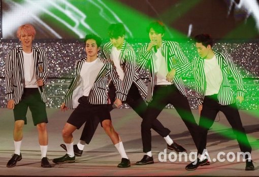 그룹 엑소가 15일 오후 서울 마포구 상암동 월드컵경기장에서 열린 대한민국 광복 70주년 국민대합창 ‘나는 대한민국’ 에서 화려한 무대를 꾸미고 있다.