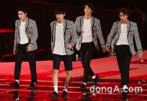 그룹 엑소가 15일 오후 서울 마포구 상암동 월드컵경기장에서 열린 대한민국 광복 70주년 국민대합창 ‘나는 대한민국’ 에서 화려한 무대를 꾸미고 있다.