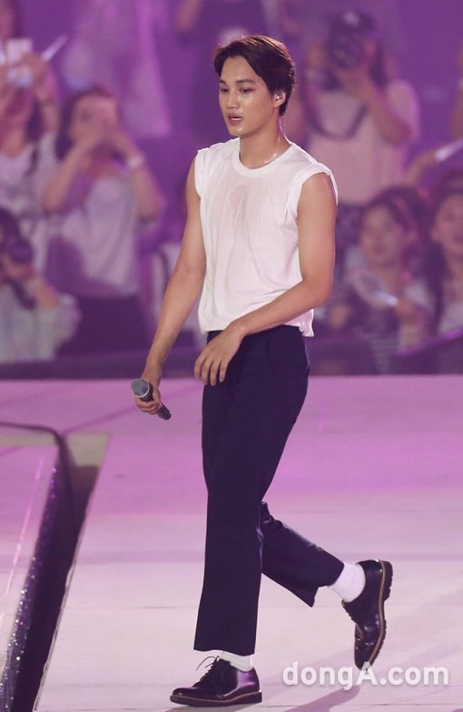 그룹 엑소의 카이가 15일 오후 서울 마포구 상암동 월드컵경기장에서 열린 대한민국 광복 70주년 국민대합창 ‘나는 대한민국’ 에서 화려한 무대를 꾸미고 있다.